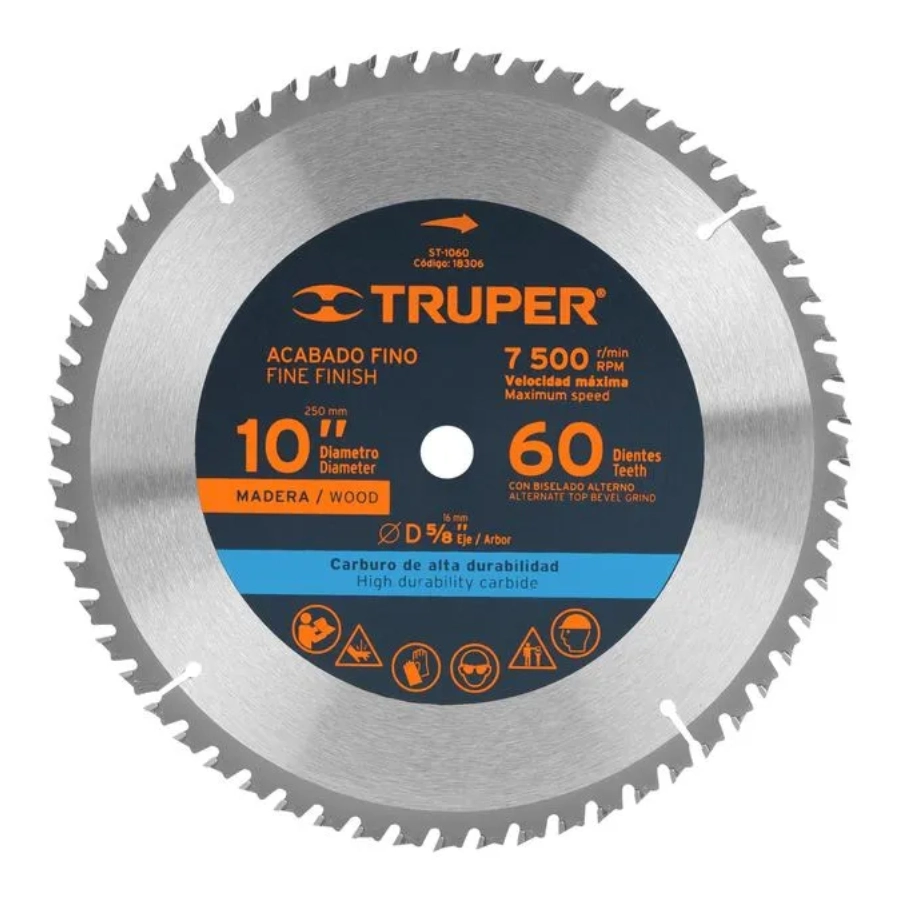 - Todos son discos sierra para madera de Truper con diámetro de 10″ (250 mm).