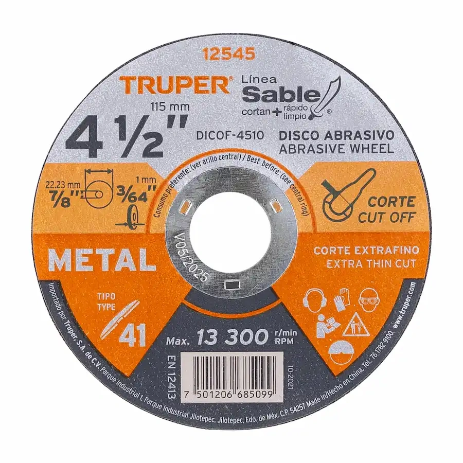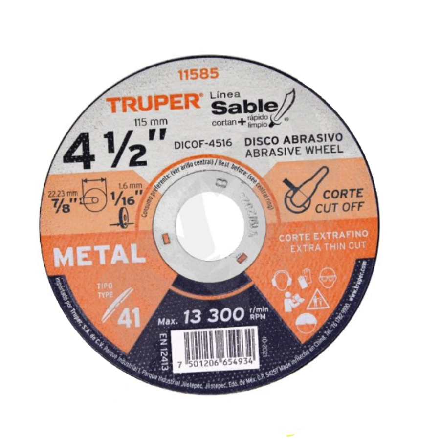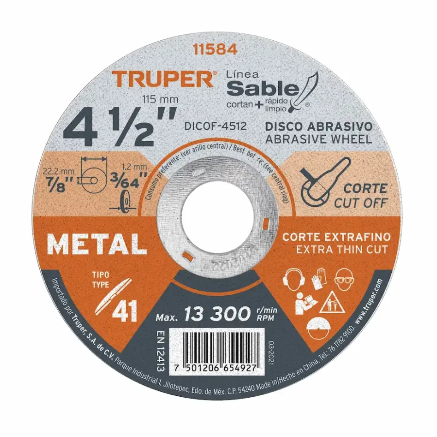 | 12545 | DICOF-4510 | 4½» (115 mm) | 1 mm | 7/8″ | 13,300 rpm | Óxido de aluminio | Corte preciso y limpio en metal |