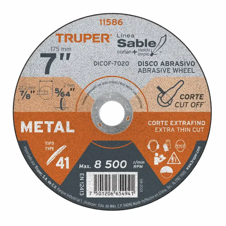| 11586 | DICOF-7020 | 7″ (175 mm) | 2 mm | 7/8″ | 8,500 rpm | Óxido de aluminio | Mayor espesor para cortes moderados |
