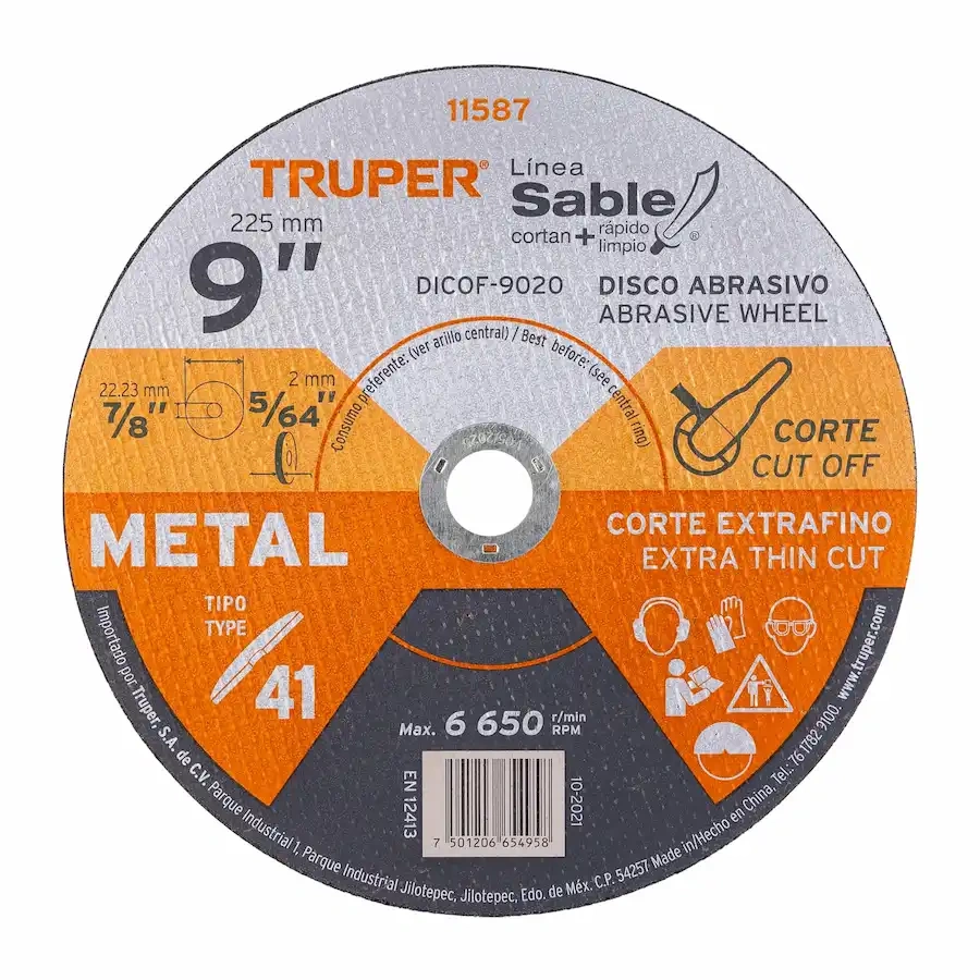 | 11587 | DICOF-9020 | 9″ (230 mm) | 2 mm | 7/8″ | 6,650 rpm | Óxido de aluminio | Disco grande para cortes largos y precisos |