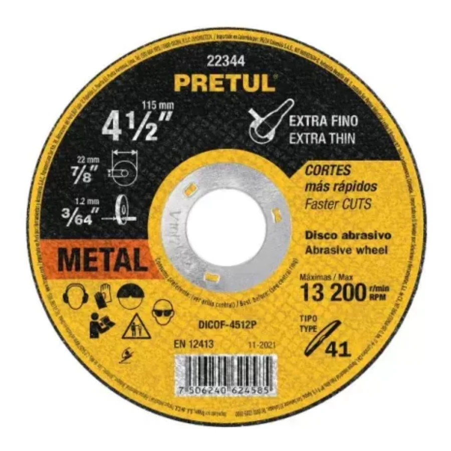 | 22344 | DICOF-4512P | 4 1/2″ (115 mm) | 1.2 mm | 7/8″ (22.2 mm) | 13,200 rpm | Óxido de aluminio | Tipo 41 (corte) | Encogible |