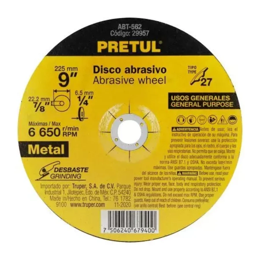 | 29955 | ABT-560 | 4 1/2″ (115 mm) | 1/4″ (≈6.5 mm) | 7/8″ (22.2 mm) | 13,200–13,300 rpm | Óxido de aluminio | Termoencogible |