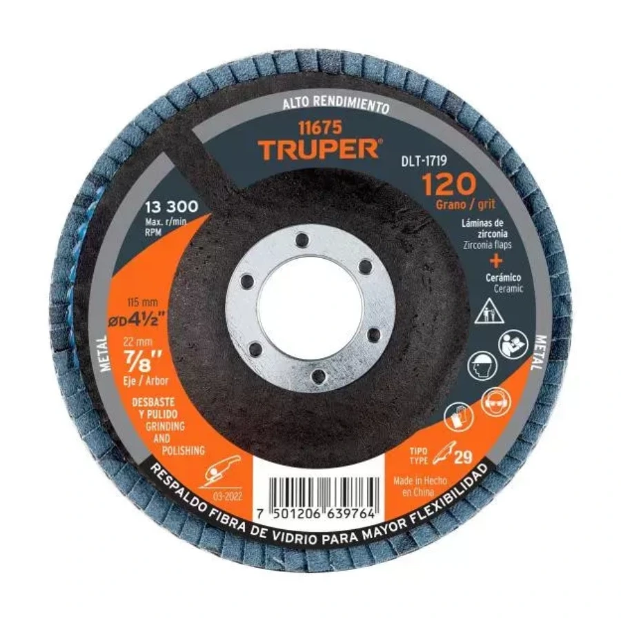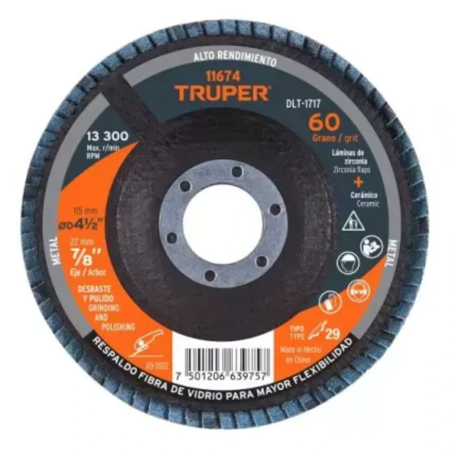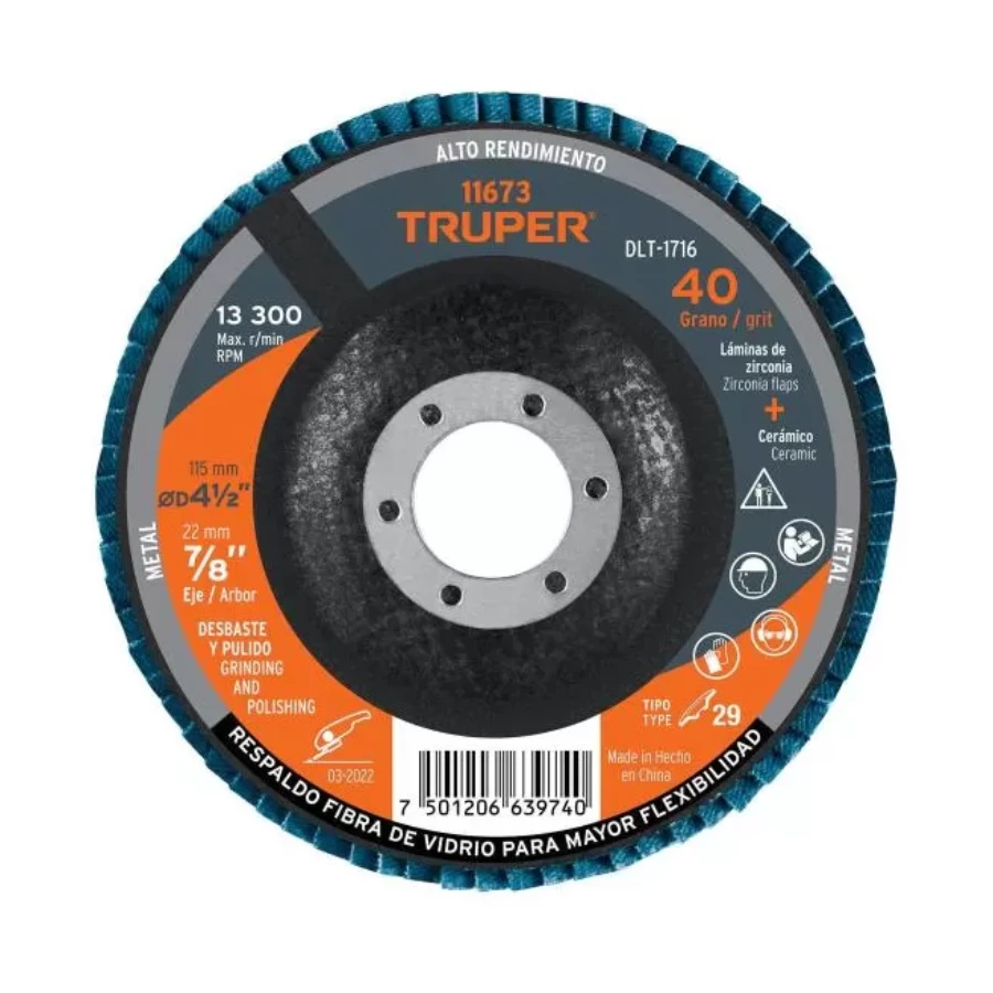 | 11673 | DLT-1716 | 4 ½” (115 mm) | 7/8” (22 mm) | 40 | 13,300 rpm | Tipo 29 | Desbaste agresivo, soldadura, limpieza pesada |