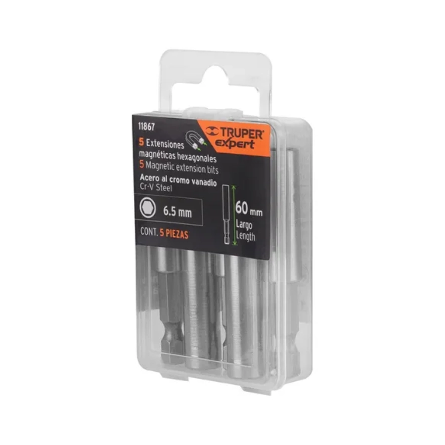 | 11867 | PUDE-9060 | 60 mm | Estuche con 5 extensiones magnéticas de 60 mm. Fabricadas en acero al cromo-vanadio, 2× más resistentes al desgaste que las de acero al carbono. Zanco de 1/4″. |