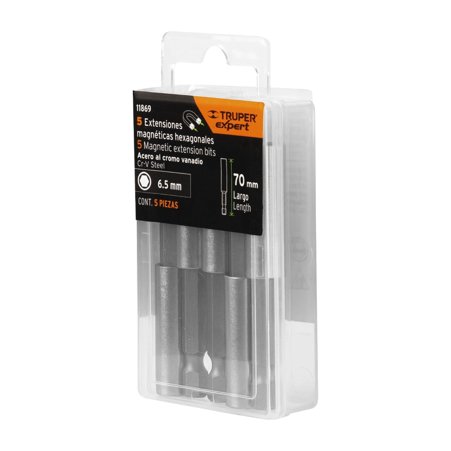 | 11869 | PUDE-9070 | 70 mm | Estuche con 5 extensiones de 70 mm, magnéticas. Construcción en acero cromo-vanadio, maquinado preciso y zanco de 1/4″. |