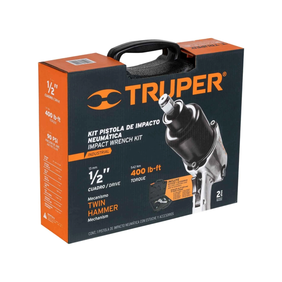 - Tipo: Kit de llave de impacto neumática industrial de 1/2″ con accesorios y estuche plástico.