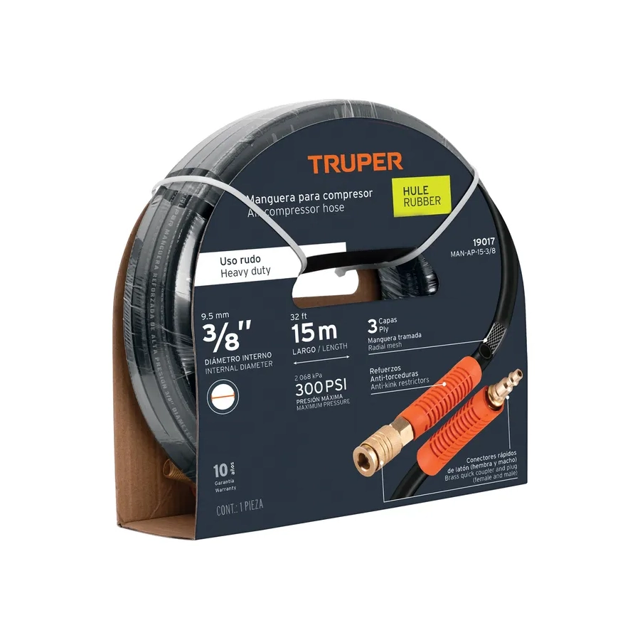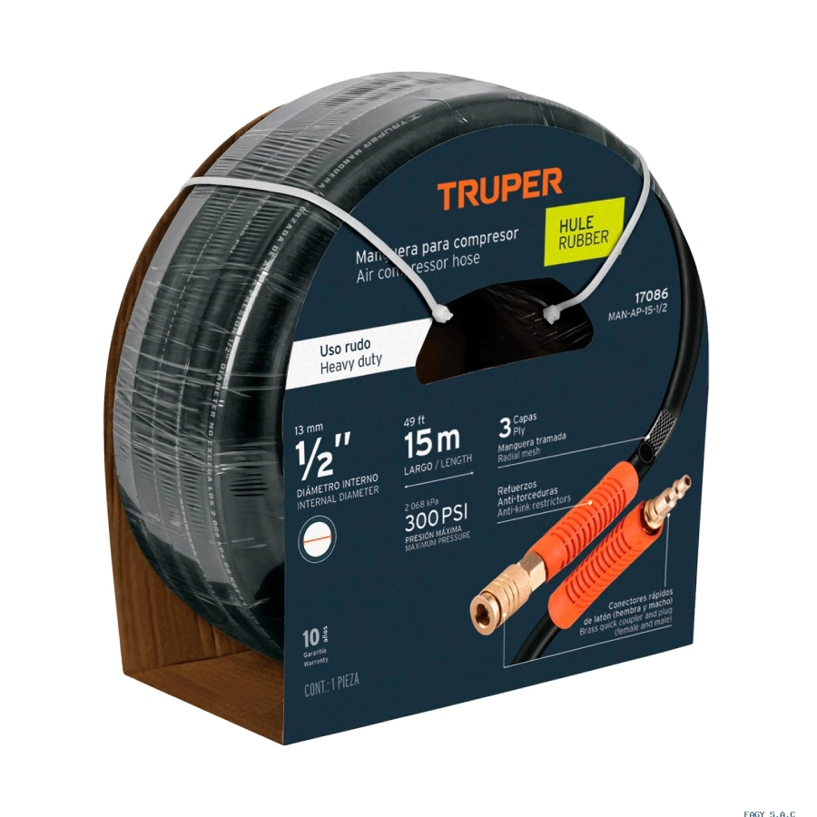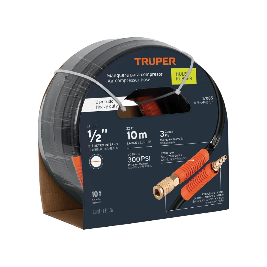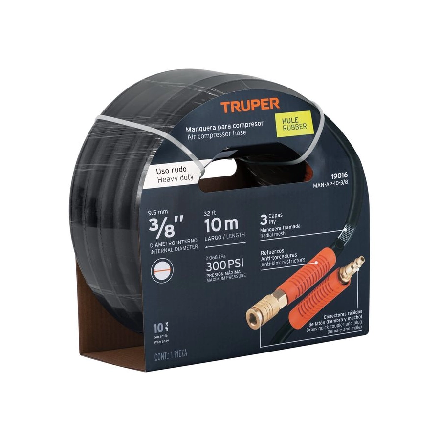 - Manguera de hule reforzada y trenzada de 3 capas, que evita deformación o grietas y ofrece alta flexibilidad.