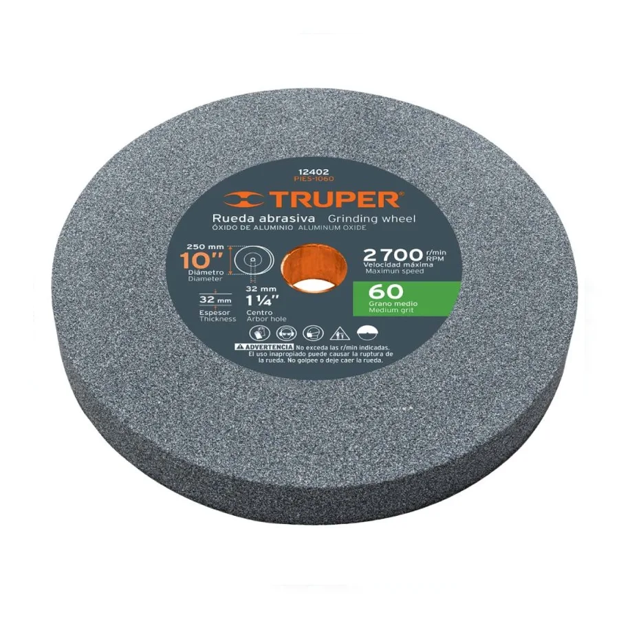 | 12402 | Piedra para esmeril 10″ grano 60 | 10″ (250 mm) | 1 1/4″ (32 mm) | 1 1/4″ (32 mm) | 60 (medio) | 2,700 rpm | Óxido de aluminio | Uso general, afilado y rectificado de acero ferrometalúrgico |