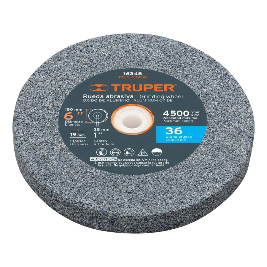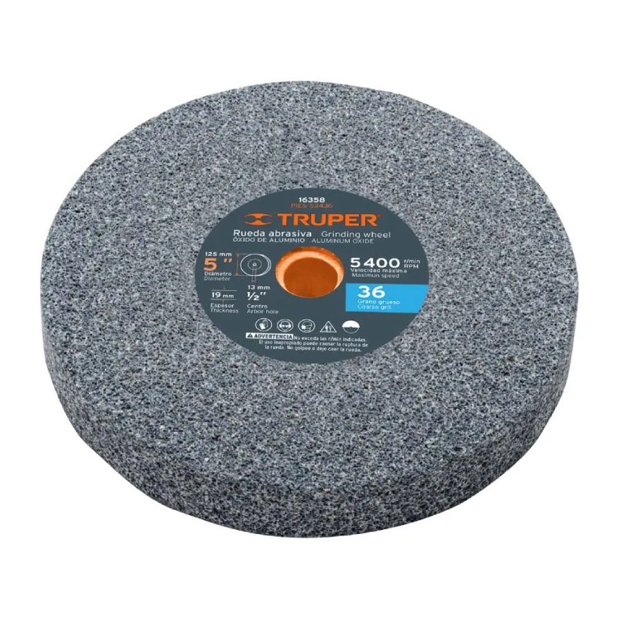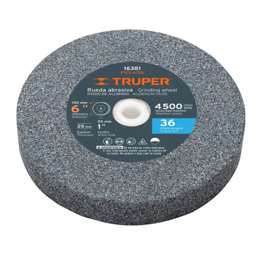 | 16348 | Piedra para esmeril 6″ grano 36 | 6″ | 3/4″ | 1″ | 36 (grueso) | 4,500 rpm | Óxido de aluminio | Para desbaste más agresivo |