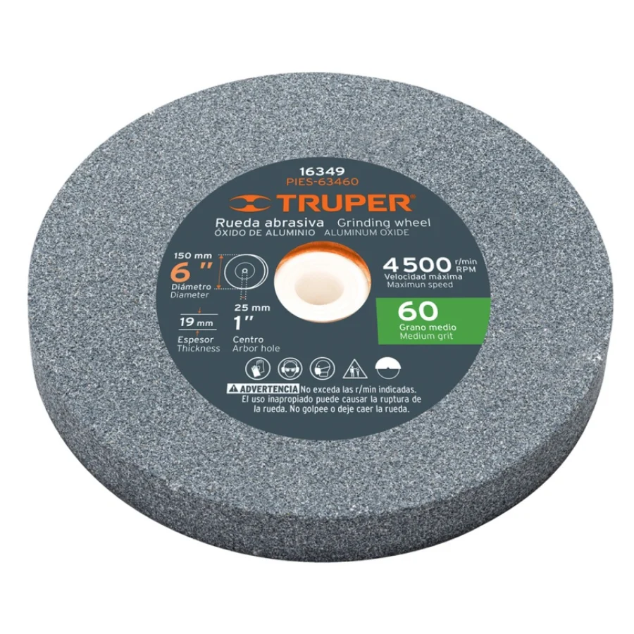 | 16349 | Piedra para esmeril 6″ grano 60 | 6″ | 3/4″ (19 mm) | 1″ (25 mm) | 60 (medio) | 4,500 rpm | Óxido de aluminio | Uso general abrillantado/desbaste |