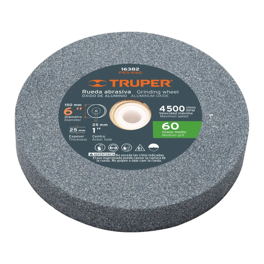 | 16382 | Piedra para esmeril 6″ grano 60 | 6″ (150 mm) | 1″ (25 mm) | 1″ (25 mm) | 60 (medio) | 4,500 rpm | Óxido de aluminio | Uso general, desbaste y afilado intermediario |