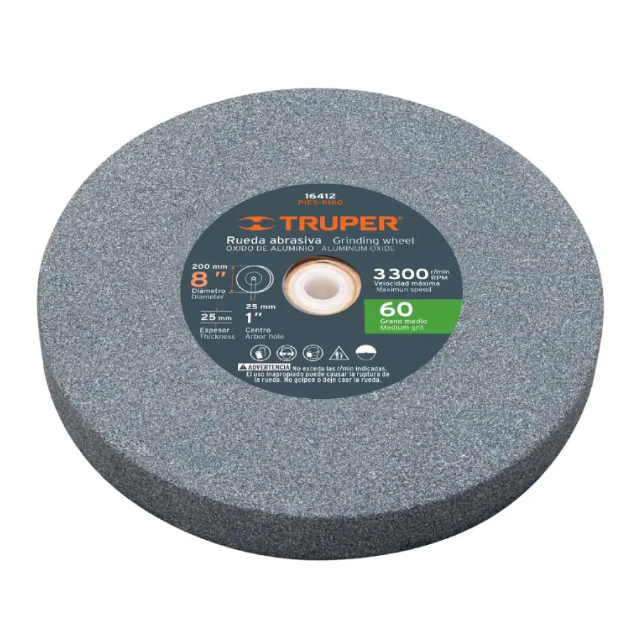 | 16412 | Piedra para esmeril 8″ grano 60 | 8″ (203 mm) | 1″ (25 mm) | 1″ (25 mm) | 60 (medio) | 3,300 rpm | Óxido de aluminio | Incluye adaptadores para montura estándar |