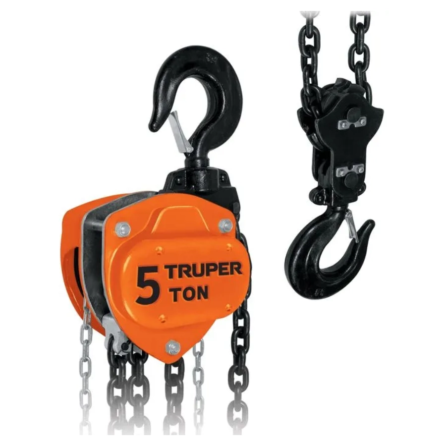 | 16828 – POL-5 | 5 toneladas | Levantamiento estándar 3 m, cadena de carga de 6.80 m, eslabones de 9 mm, apertura de gancho 40 mm, móviles de seguridad, freno doble trinquete, triple engranaje. |
